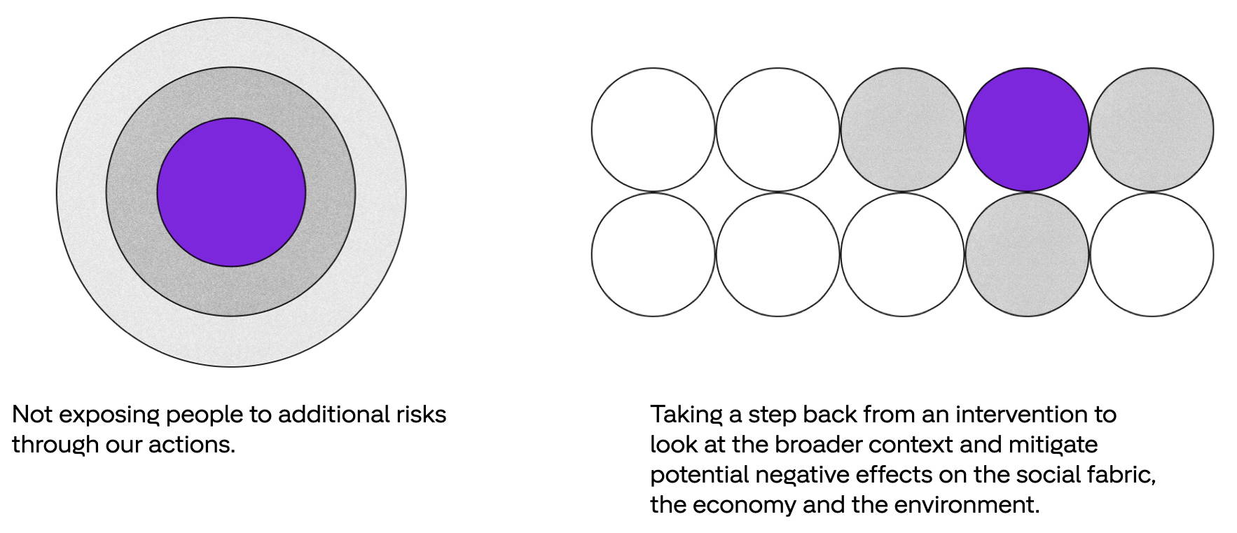 The language is a translation from old Greek that can be broken down into two main directives: First, not exposing people to additional risks through your actions, and second, taking a step back from an intervention to look at the broader context and mitigate potential negative effects. In the context of design, that typically means consideration for the individual, society, economy, and environment. There are also different types of harm to consider in this framework, which can include physical, psychological, environmental, and societal, to name a few.